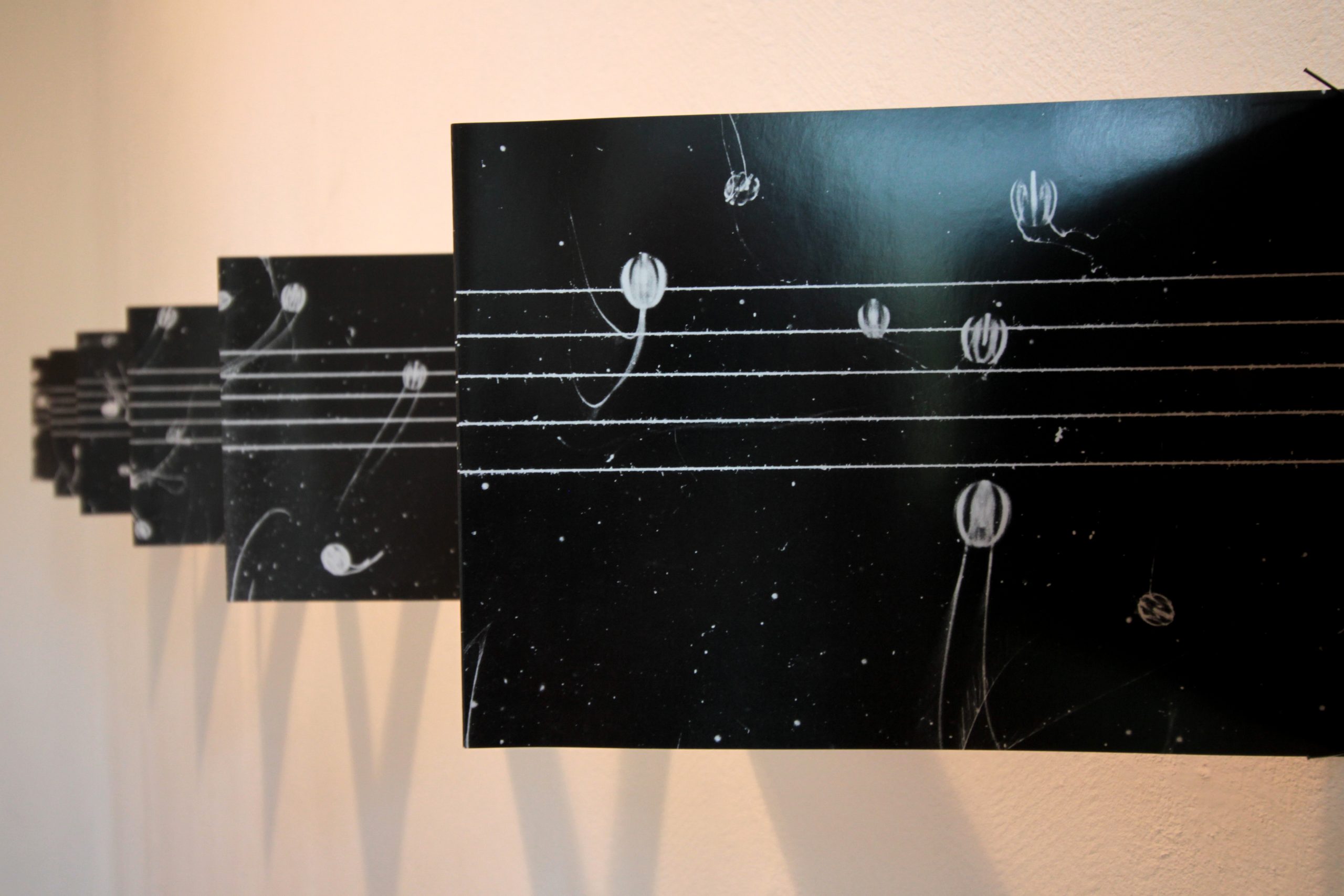 Das Werk der naturwissenschaftlich geschulten Konzeptkünstlerin Marianne Greve umfasst die Verknüpfung unseres Natur-Kulturverhältnisses. In ihren Partituren macht nicht nur der Ton die Musik. Gleichberechtigt mit dem Klang sind die als Leporello dokumentierten Entstehungsphasen: Es entstehen assoziative Hörbilder. In der Plank-Ton-Melodie I schwimmt Pleurobrachia pileus – die Stachelbeerqualle – vor der klassischen Notenlineatur und bestimmt so die jeweiligen Notenwerte. Die lautlosen Schwimmbewegungen, das Gleiten und Treiben, werden durch das Cello instrumentiert. Die Stachelbeerqualle ist eine besondere Vertreterin für Symmetrieformen in der Natur – zwei konkrete Spiegehälften teilen ihren Körper.Das Prinzip dieser seriellen Arbeiten besteht darin, Naturprozesse zu veranschaulichen und mit der geistigen Welt in Beziehung zu setzen.